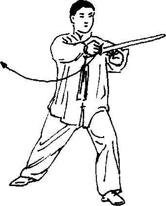 左脚向前进半步,成左弓步;同时,右手剑立剑直向前刺 出,高与胸平,力注剑尖;左剑指附在右手腕部;眼看前方(图 13一59)o