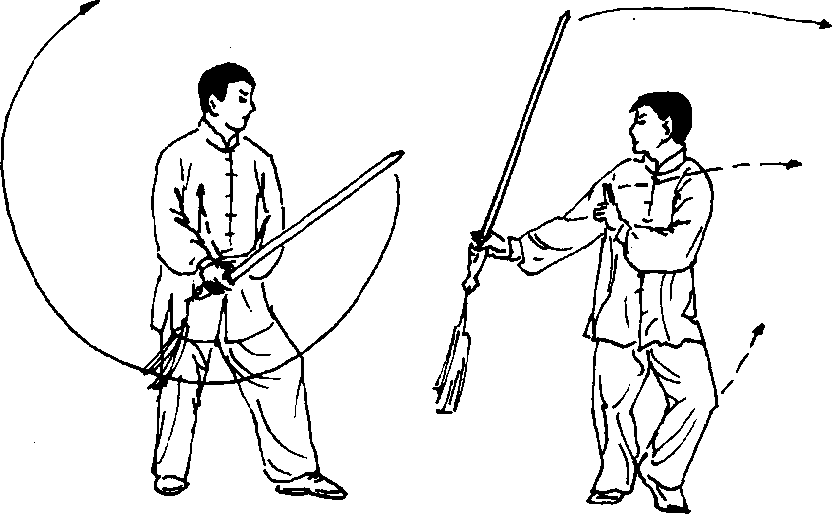 【攻防意识】练习时可设想对方再次“直刺剑”,我向后沉 腕抽剑,以剑身的“下刃中段”格挡对方剑身的“上刃前段”,随 之挑转剑身,用剑尖反刺对方的面部。左手剑指“前指”可想像 为虚晃动作,为反刺剑开道,或向前戳点对方的面部。