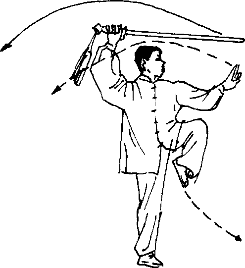 (二) 上体左转,左膝提起,成独立势,脚尖下垂;同时右手 渐渐上举,使剑经头部前上方向前刺出(拇指向下,做反手立 剑),剑尖略低,力注剑尖;左手剑指则经下须处随转体向前指 出,高与眼平;眼看剑指(图13—10)。