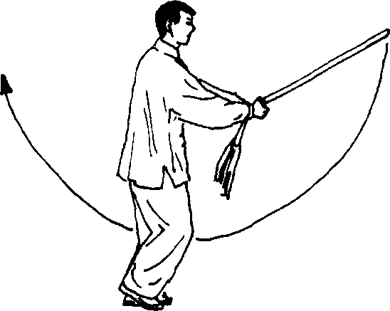 【要 点】劈剑时,身体和头部向左转,然后随剑的抡劈方 向再转向前方。提膝和劈剑要协调一致。整个动作过程要连 贯不停。