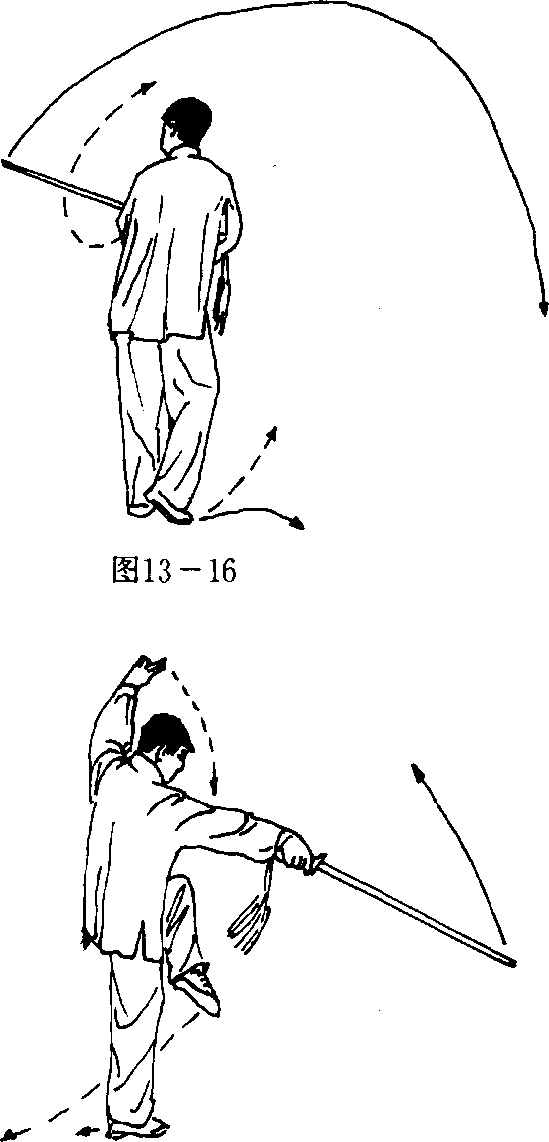 右脚前进到左脚内侧,脚尖着地;左手从头部左上方落至 右腕部;然后身体左转,右手抽剑由前向下、向后划弧,经身体 左下方旋臂翻腕上举,向前下方正手立剑劈下,力在剑下刃; 左手剑指则由身体左侧向下、向后转至左额上方,掌心斜向 上;在抡劈剑的同时,右脚前进一步,左腿屈膝提起,成独立 步;眼看剑尖(图13一15、图13—16、图13―17) 0