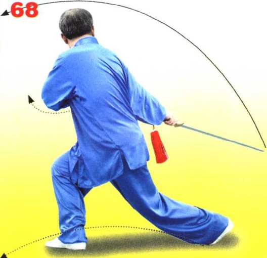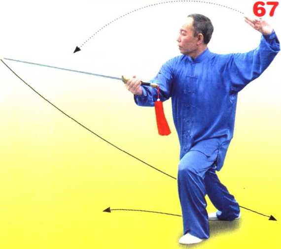 左脚向左前方上步, 重心前移成左弓步;同 时前臂外旋,手心朝上, 屈肘向左后带剑至左肋 前,剑尖斜朝前;左手 剑指经下向左向上,臂 呈弧形举于头侧上方, 手心斜朝上。目视前方。 (图 66、67)