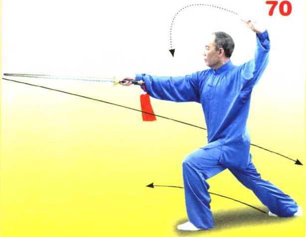 上体左转,左脚向 前上步成左弓步;同时 右手握剑经上向前劈剑, 与肩同高;左手剑指经 下向左上方划弧,臂呈 弧形举于头侧上方,手 心斜朝外。目视前方。 (图 70)