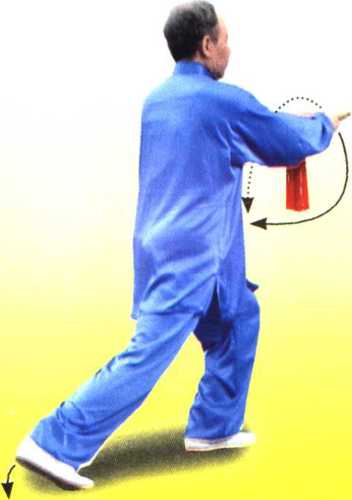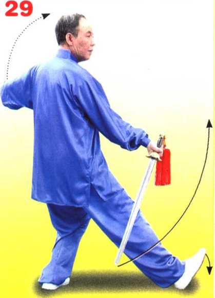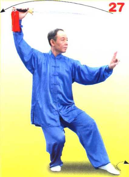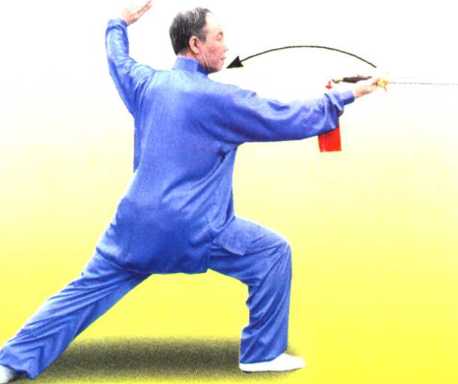 ① 左右转体带剑时以腰带臂,以臂领剑,使步、腰、臂、剑协调 一致。剑左右摆动要柔和、连贯、平稳。