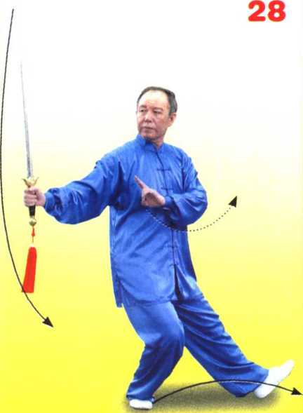 左腿屈膝半蹲,重 心后移,身体略向左转; 同时右手握剑随转体向 左平带,手心朝上,腕 同胸高,剑尖朝向右前; 左手剑指屈肘下落附于 右腕部,手心朝下。目 视剑尖。(图31)