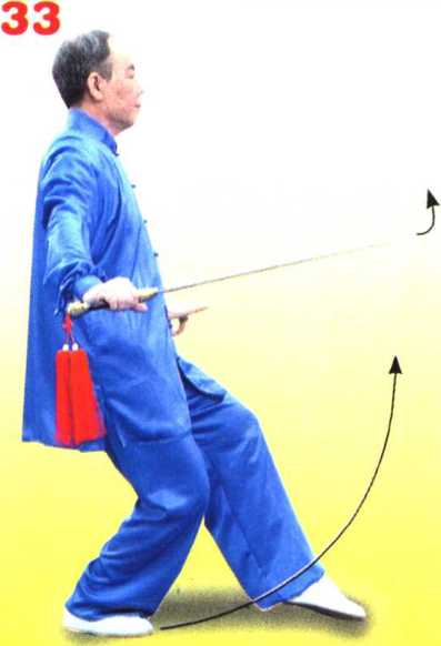 随重心后移成左虚步;同时 右手握剑随转体手心转向下,使 剑经体前向右平带至右胯旁,剑 尖朝左前;左手剑指向下、向左 划弧至左胯旁,手心朝下。目视 前方。(图33)