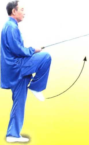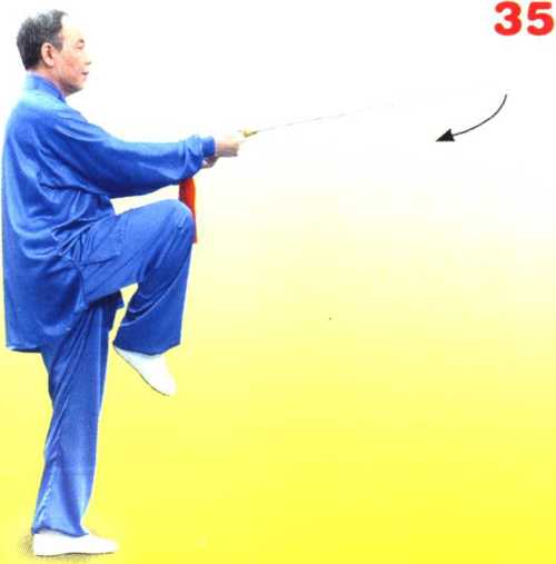 左腿自然直立,右 腿屈膝提起成左独立步; 同时两手手心翻转朝上 随提膝由两侧向胸前相 合,左手剑指捧托在右 手背下,与胸同高;剑 尖朝前,略高于腕。目 视前方。(图35)