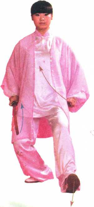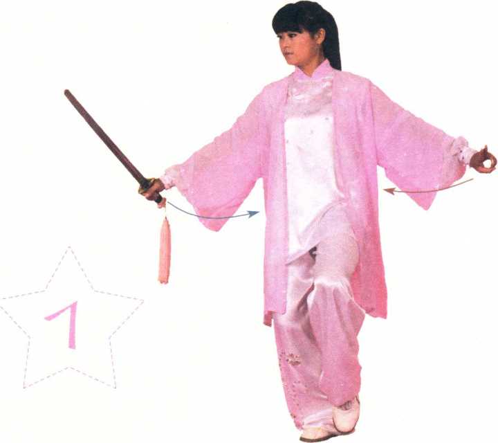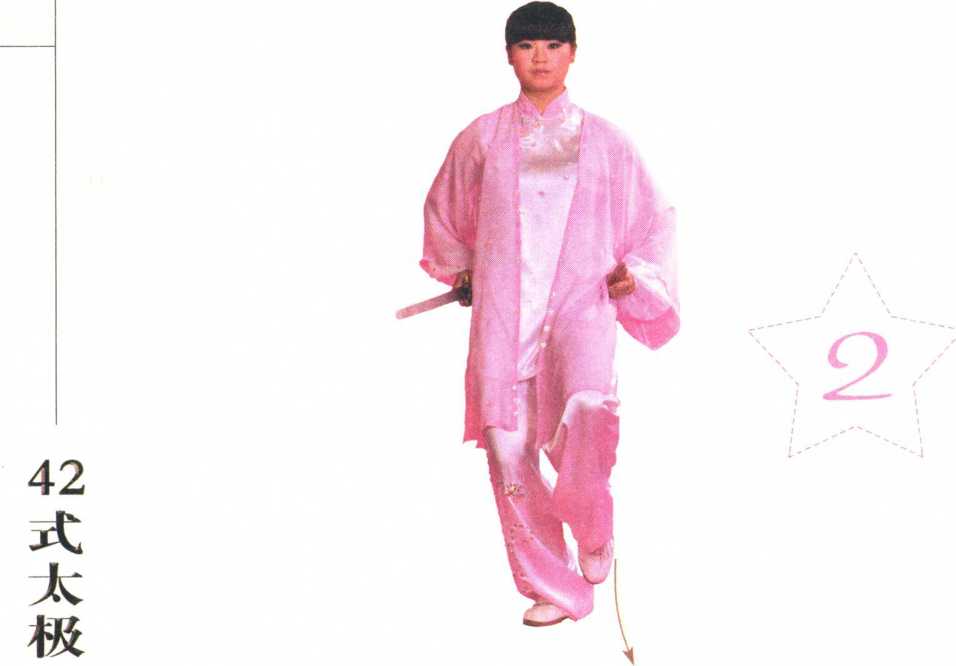 2. 刺剑为立剑,高与肩平。 步方向与起式相同(南)。