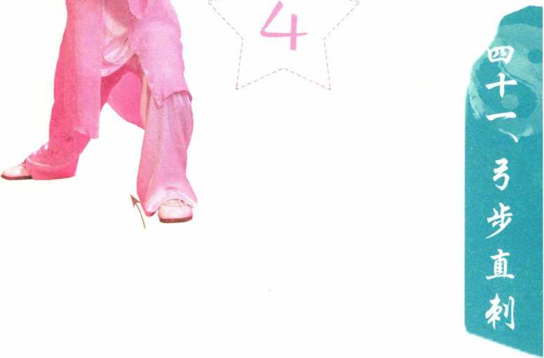 左脚向前(南)上步成左弓步, 上体略左转。右手握剑立剑向前直 刺o左手剑指在胸前与右手相合,附 于右腕内侧后向前伸送,手心斜向 下。目视前方。(图41-3、图41-4)