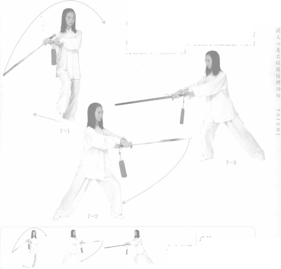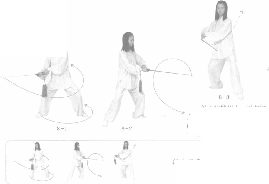 剑心翻转朝上,以左脚 为转轴,右脚尖扫地逆时针 画弧,面转朝西,这里又是 一个闭门剑。(8-1、2, 3)