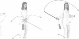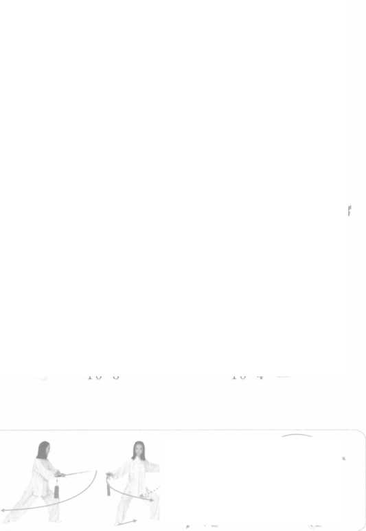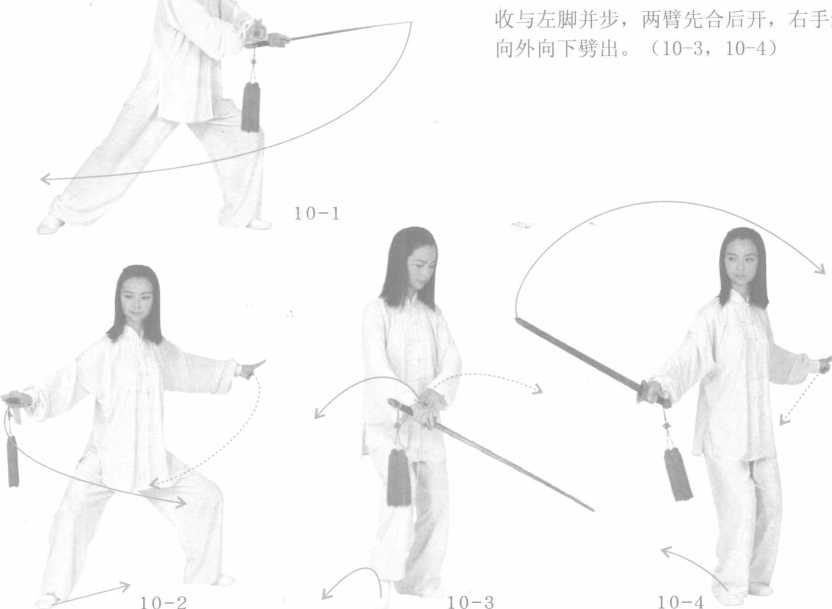右手剑逆时针画小弧,双臂打 开,两心向下(10-1, 10-2);右脚回