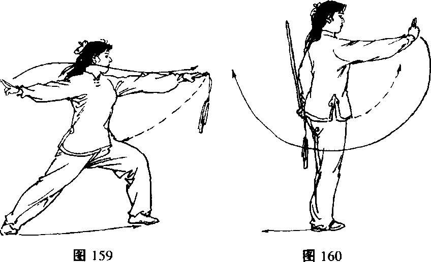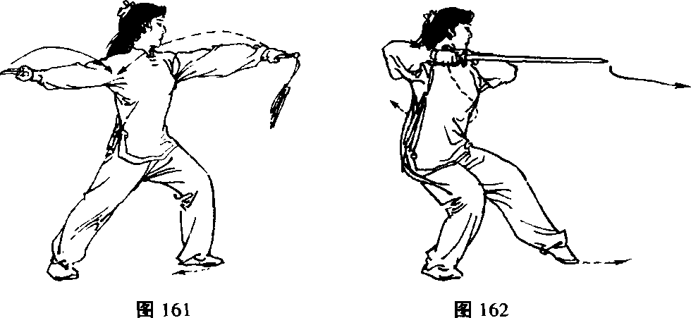 (2)身体左转约90°;随转体左脚向前上步屈膝成弓步; 同时左手持剑随转体向上经右胸前绕至体前,与肩同高,手心 斜向下,右剑指向后抬起,与肩同高,手心向下;目视前方(图 159)。