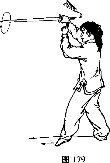 (1)身体立起;右脚向前上步,随之左脚再向前上步成虚 步;同时右手握剑,以腕为轴,逆时针划弧一周后随上步架起, 手心向右;目视前方(图179 )o