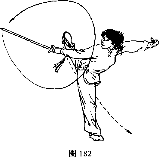 (2)左脚蹬地起跳,同时右脚下落支撑站立,左脚向体后 撩踢成望月平衡;右手握剑向下、向后直臂撩出,剑尖略高于 头部,小指侧剑刃向上,左剑指向下、向左挑起,与头部同高; 目视剑尖(图182 )。