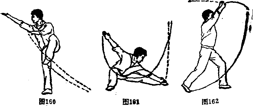 (D重心前移,右腿前蹬,两腿微屈;身体左转,左臂 前上摆,右臂向下、向前上方抡摆,掌背在头部前上方与左 掌心拍击。两肘微屈;目视前方(图162)。