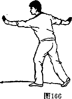 (1)左脚向左前下落,右腿前蹬,重心左前趋(图166)1