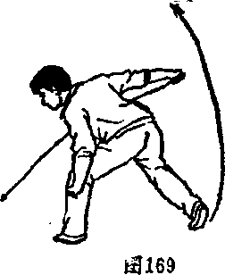 (3)重心前俯,右脚落地紧跟蹬地跳起,左腿屈膝前 摆;两臂向上带起;目视前下方(图168)0