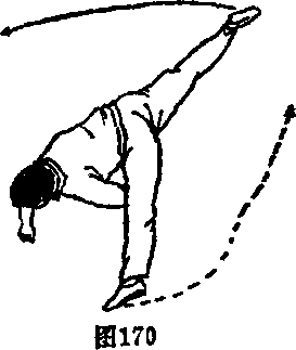 (5)左腿用力蹬地,右腿向后上方摆起,脚面绷平;两 臂自然前摆,上体前俯;目视前方地面(图170)。