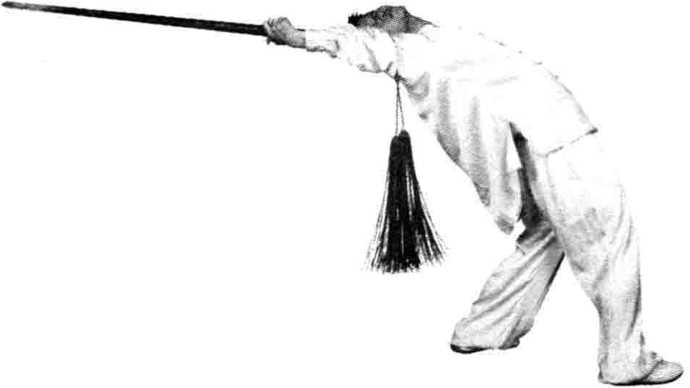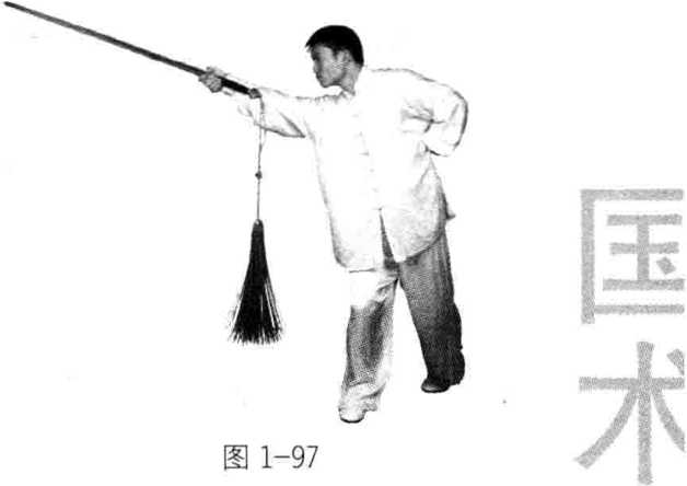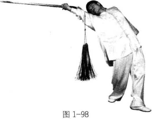 (2)右脚继续向左前上一步。同时,上体向原刺剑 方向侧探,左剑指经左腋下沿上体左侧后方穿下(图1- 97) o