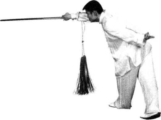 向左走小圆,从左脚开始,到右脚落步共四小步。 注意后仰翻转成反弓形,身、肩、臂、剑随步向同一方 向旋转,剑向后直臂伸探,全身各部要协调配合,提刺