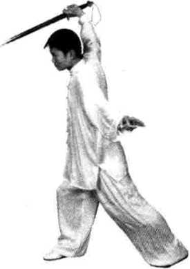 (2)重心移至左腿,直立,右腿屈膝提起。右手持 剑向前方平刺,手心向上,左手剑指上架至头左侧上方。 目视前方(图1-105)。
