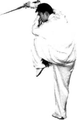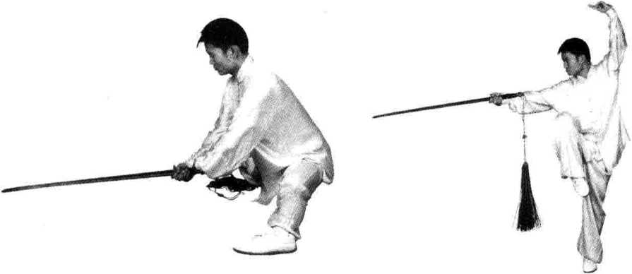 (5)右腿站立挺直,左腿屈膝提起。同时,右手持