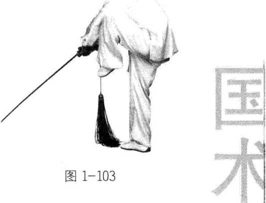 接上动,右手持剑,使剑尖 经右向前下截击落于小腹前,手 心斜朝上,剑尖斜朝下;左臂经 左向下落于右手腕内侧,手心向 下。目视前下方(图1-103)。