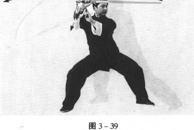 (1)身体右转,右腿弓膝塌劲,身体重心右移至两腿之 间,成马步,同时右臂屈肘,右手逆缠向内转至右侧额前上 方,手心向前,剑尖向左,左手随右手转动;身体继续右转, 重心移至右腿,形成右骗马步,右手变顺缠,剑向上向右下方 划弧转落至右侧前方,收至右膝前上方,手心向前,剑尖斜向 右前上方,左手随右手向下转落,剑指落至右小臂内侧,手心 向下,眼看右前方(图3-39、3-40)。