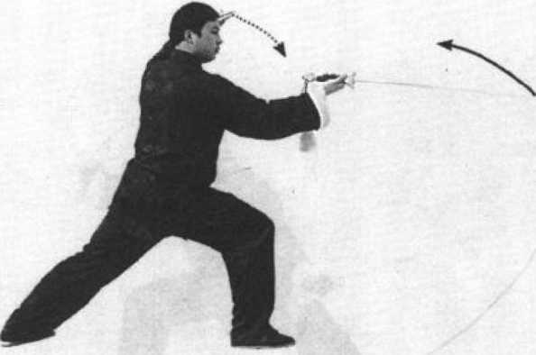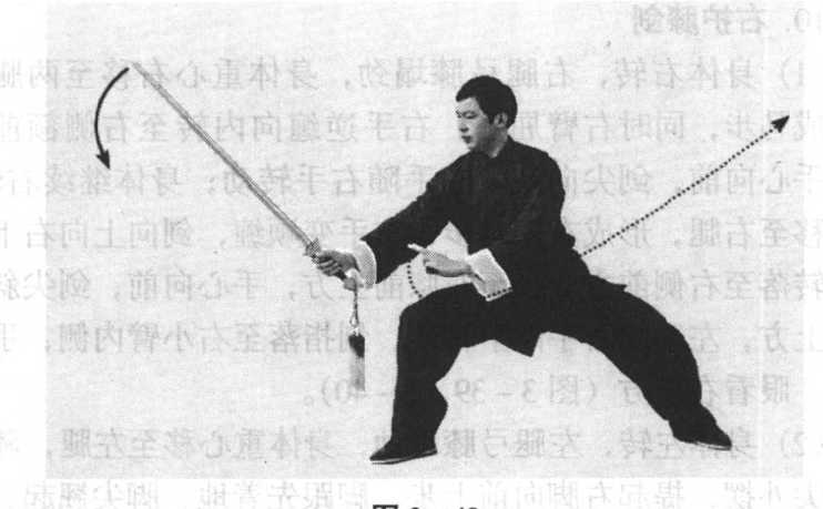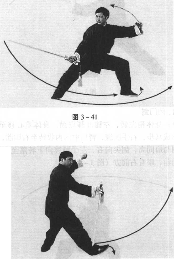 前,剑指斜向右前方,眼看右前方(图3-43)。