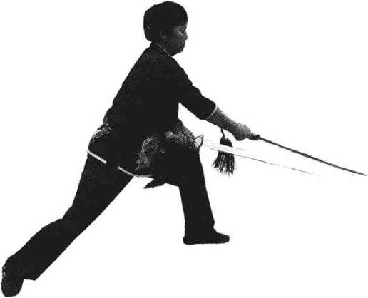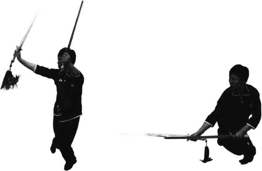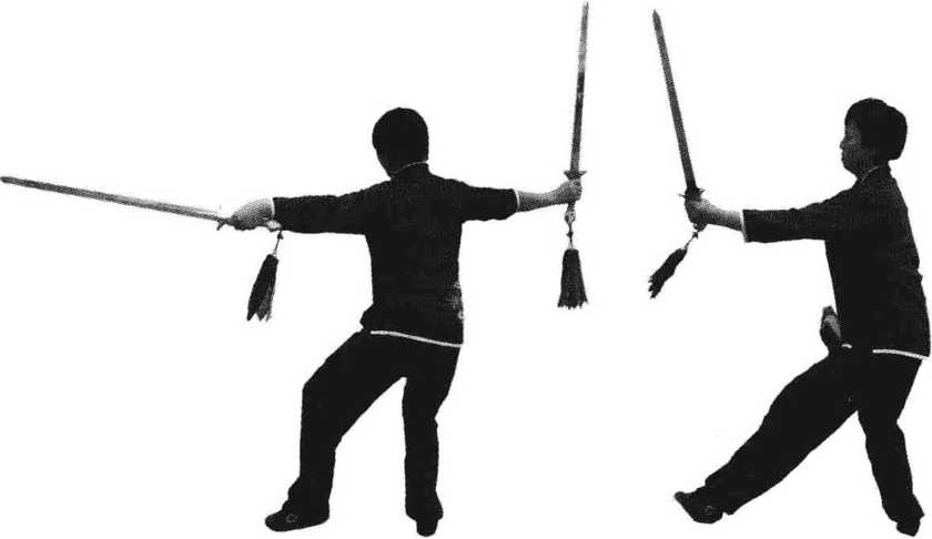 (1)接上式,身法上领,重心左移,右手持剑由上向下斜劈, 左手持剑横扫,如图3.21」所示。