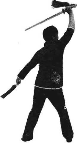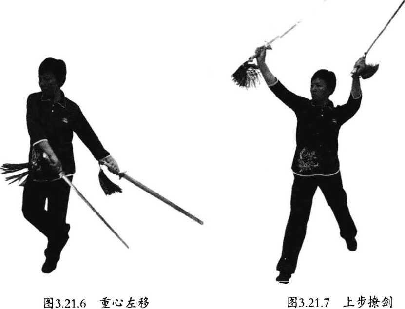 (4)身体左转90度,重心左移,提右腿向前方上步,同时双剑 顺时针划弧上撩,于体前上方,如图3.21.6、图3.21.7所示。