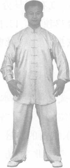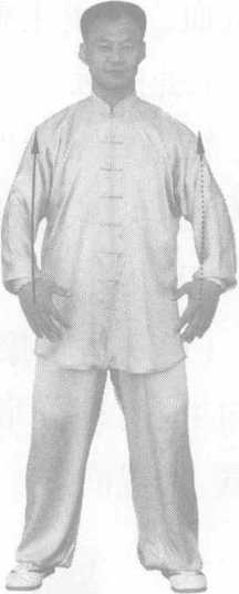 (2)双腿蹬地慢慢站起,同时两手缓缓合于腹前,目视