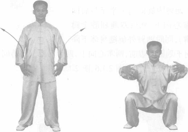 要点:下蹲要缓慢柔和,两臂向下划圆应保持弧形,上 下配合要协调一致。
