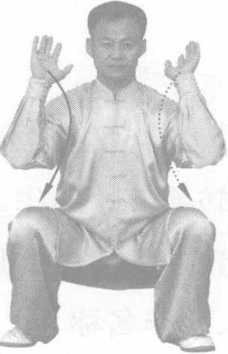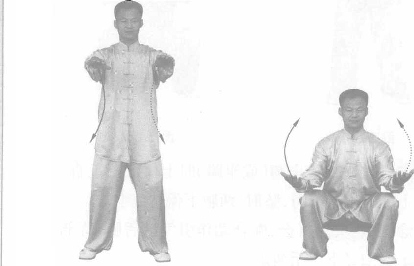 两腿缓缓屈膝全蹲(或半蹲),两臂屈肘,两掌心斜向上,停