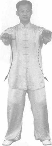 意念:以意贯注命门,配合动作引气沿督脉上行于夹脊 后,分别沿两肩井循两臂外侧手三阳经至两手指端。