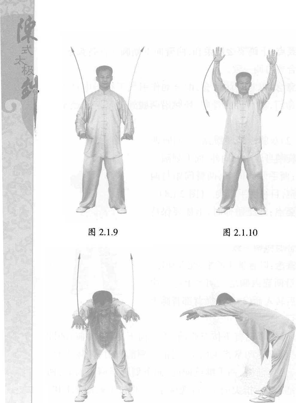 图 2.1.8图 2.1.8(3)两手屈臂下按至腹前,手心向下,指尖向前;随即 垂肘、坐腕使两掌指尖向上、向前至额前方时,上体正直; 然后,上体前俯,两手继续向前、向下划圆至两脚前方,两 手掌心向内,指尖向下,目视两手。(图2.1.9、图2.1.10、 图 2.LH)