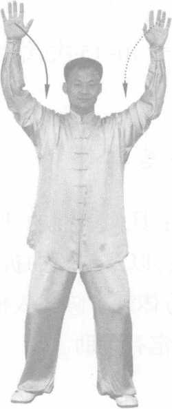 (4)慢慢立身至身体中正,同时两臂随身体直立上举;