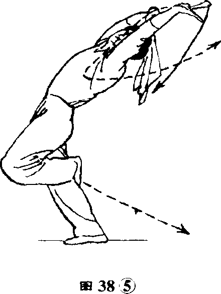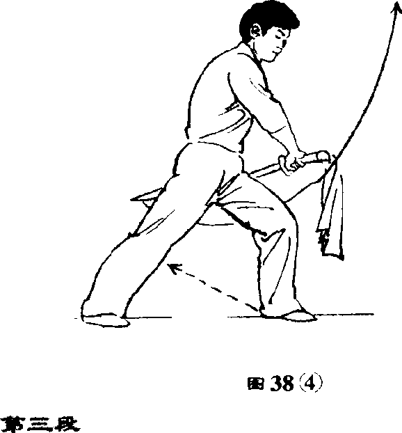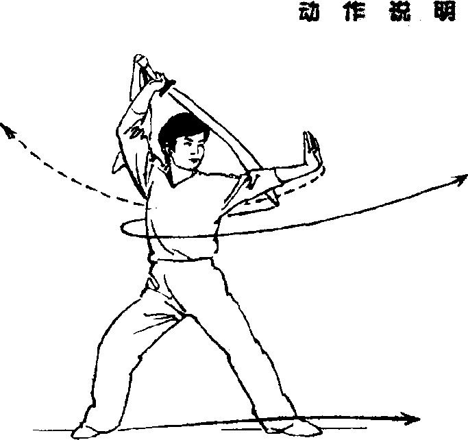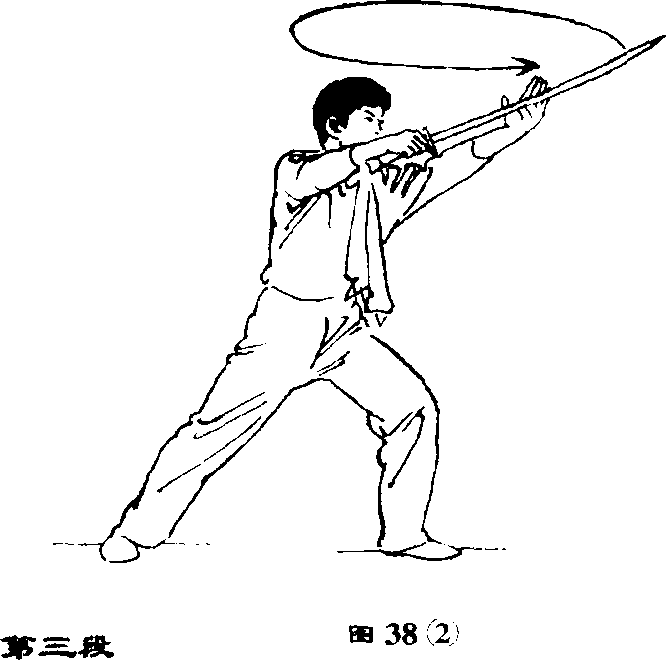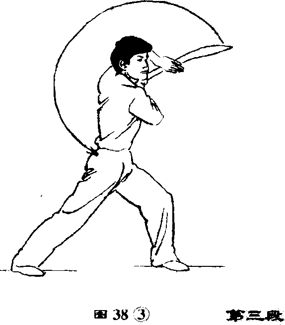 ③上体后仰;右手持刀以腕为 轴向左在头前上方水平绕环一周, 刀刃向左,刀尖向前,左手紧贴刀 背。(图38③)