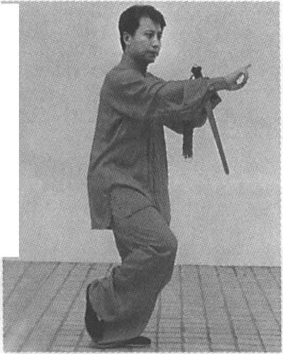 Key points: Lift the wrist when pointing the sword forward with the force focused on the tip of sword. Keep the upper body upright and comfortable and do not hunch the back or stick out the buttocks.