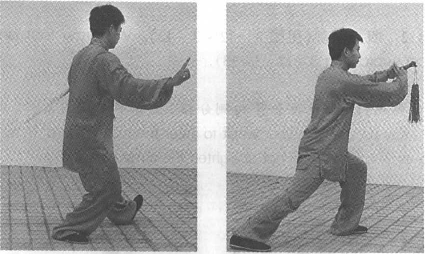 要点:点剑要提腕,力达剑尖。上体中正安舒,不可弓 背翘臀。