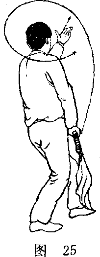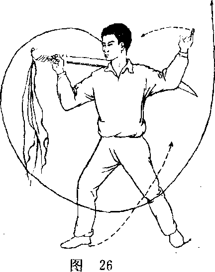身体右转(面南),两腿微屈;右手持刀从下向上举,刀 身成水平,刀背不触肩,经头上向右横摆扛于肩上,刀刃向 上,刀尖朝后,左手经腰间向外托起,掌心向上,指尖朝外,与右手臂对称;目视右手。(图26) . 1要点:右手持刀向右横摆越,与转体同时进行,要协调 一致。