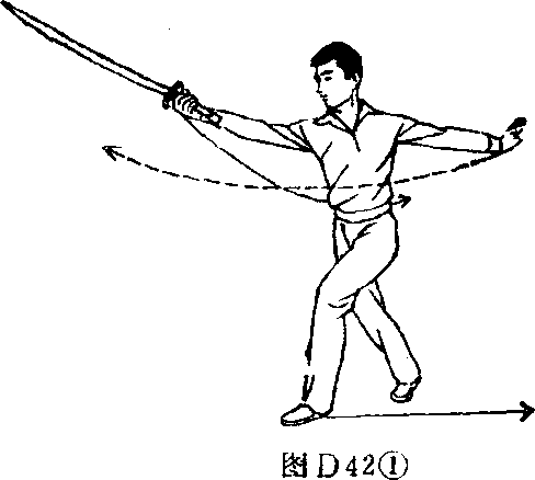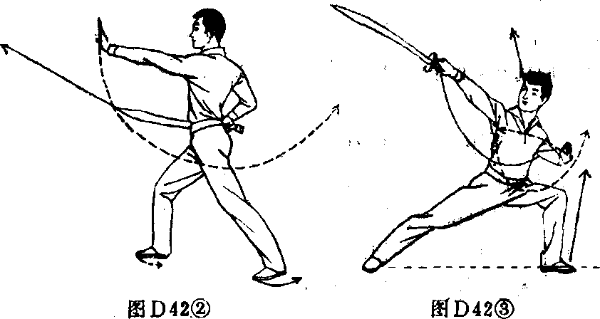 后,掌指朝上。目视刀尖 (图D42①)。