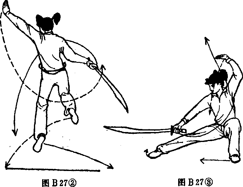 3.在空中,继续向左后转体,右脚先落地,左脚随即在体左 侧落地,左腿屈膝全蹲,右腿挺膝伸直平铺成右仆步。同时, 左掌随转体直臂向下、向左、向上弧形绕至头左上方时,屈肘横 架成亮掌;右手持刀顺势向上、向右下劈刀,刀身平放,刀刃 朝下。目视刀身(图B27③)?