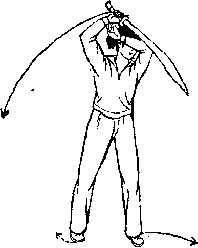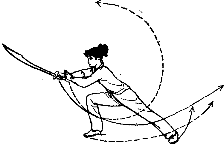 、2,上动不停。左掌由右手腕向下、向左直臂瓠形上摆;石 手持刀,向下、向左弧形上撩,刀刃朝上,上体随即左转°同