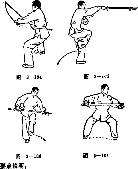 (四) 图105动作,右脚蹬力要足。左脚掌为轴心,转 动灵活。转身拧腰,右提腿与右刺剑要同时完成。动作连贯 协调,劲力顺达,重心稳固。