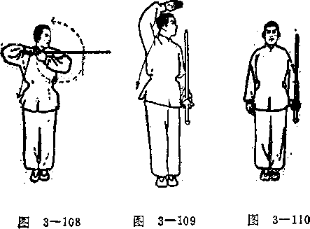 上动不停。左手正持剑下垂于身体左侧,右手向下向右 向上向头部前上方环绕,至头顶上方时屈肘亮掌。做上述动 作时,配合深长的吸气,至屈肘亮掌时领气贯入丹田。目光 转视左方(图3-109)。