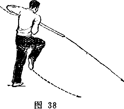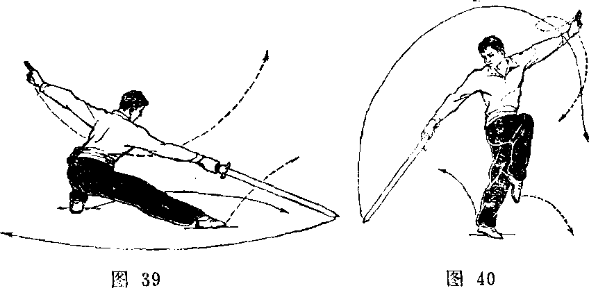 ①左脚向前跳 步,挺膝站立9右 脚屈膝提起,脚背 绷直,脚尖向下。 同时,右手持剑回 抽于胸前,手心朝右3左手剑指收于胸前,附于柄首内侧, 成独立式。目视剑尖(图38)。②上动不停。右脚向前下方擦行、伸直,脚尖里扣;左 膝全蹲,成右扑步。同时,右手持剑,臂内旋,向前下方直 刺,左手剑指向左上方指出。目视剑尖(图39 )0要点,跳步与抽剑同时进行;右脚向前擦行和向前直刺 同时进行。