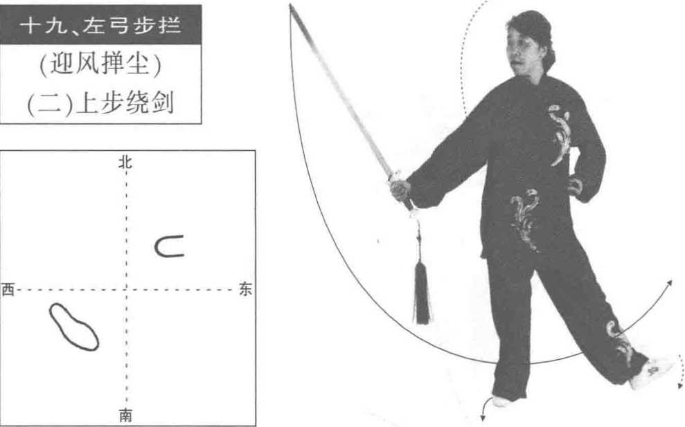 (迎风掉尘)(一)转体绕剑(迎风掉尘)(一)转体绕剑J右脚尖外摆,左脚跟外展,身体右转,两腿屈膝。同时右手持剑旋臂,手 S? 心翻转向外,随转体向前、向右、向上绕转;左手变剑指附于右腕部,随右手 绕转。眼随剑尖走。86 转体时,待重心落于右腿,左脚跟再提起。右手持剑向右、向上绕行时,右肘要弯曲,并注意松肩。随转体均匀吸气。攻防含义:设对方剑向我腕部劈来,我旋臂用下剑刃托架其剑。