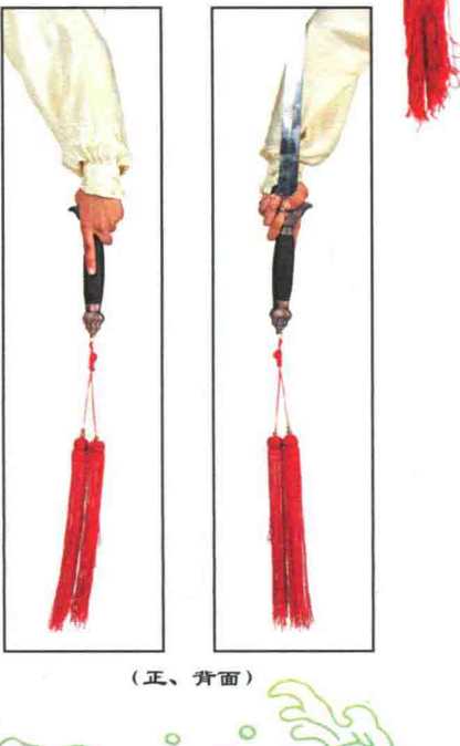 常用剑术套路的起势。持剑时,左手臂内旋,手 心朝后握住剑柄,掌心贴左剑格上,拇指扣住内侧剑 格,中指、无名指和小指扣住外侧剑格,食指伸直贴 于剑柄上,使剑身平面贴靠力懵垂立于左臂后。