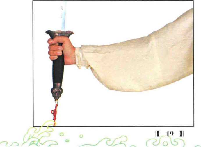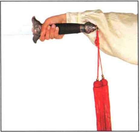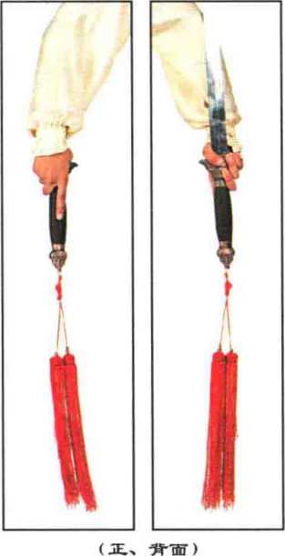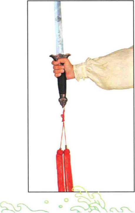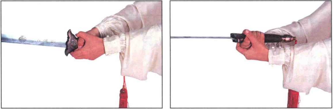虎口正对剑格,五指如同平握拳环握剑柄,拇指屈压 在食指的第2指节上,腕部挺直。这种持剑法,一般适用于 外托、下按、砍、架等。如果手心对着自己胸部,叫里手 剑;如果手背对自己胸部,手心向外,则是外手剑。